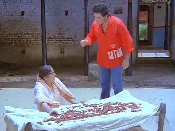 Ten years before Amrish Puri played the patriarch whose permission must be sought in DDLJ, here he is as a fiercer, more rustic version of that patriarch, the boy’s father this time, who threatens to break his son’s legs if he tries to leave home. “I’ll staple you to that horse’s back if I have to,” he growls (or words to that effect), so the next scene has Kishen in bridegroom’s garb riding along sulkily on his way to wed the “plain-looking” Chandu (Radhika). At this point you think Naseeb Apna Apna has set itself up so that one of two things will happen: 1) The parents eventually see the error of their ways, recognise that times are changing, or 2) Tradition is upheld and glorified; young man finds love with papa-certified girl, starts wearing placid white shirts with "सुन्दर सुशील बेटा" printed on them.